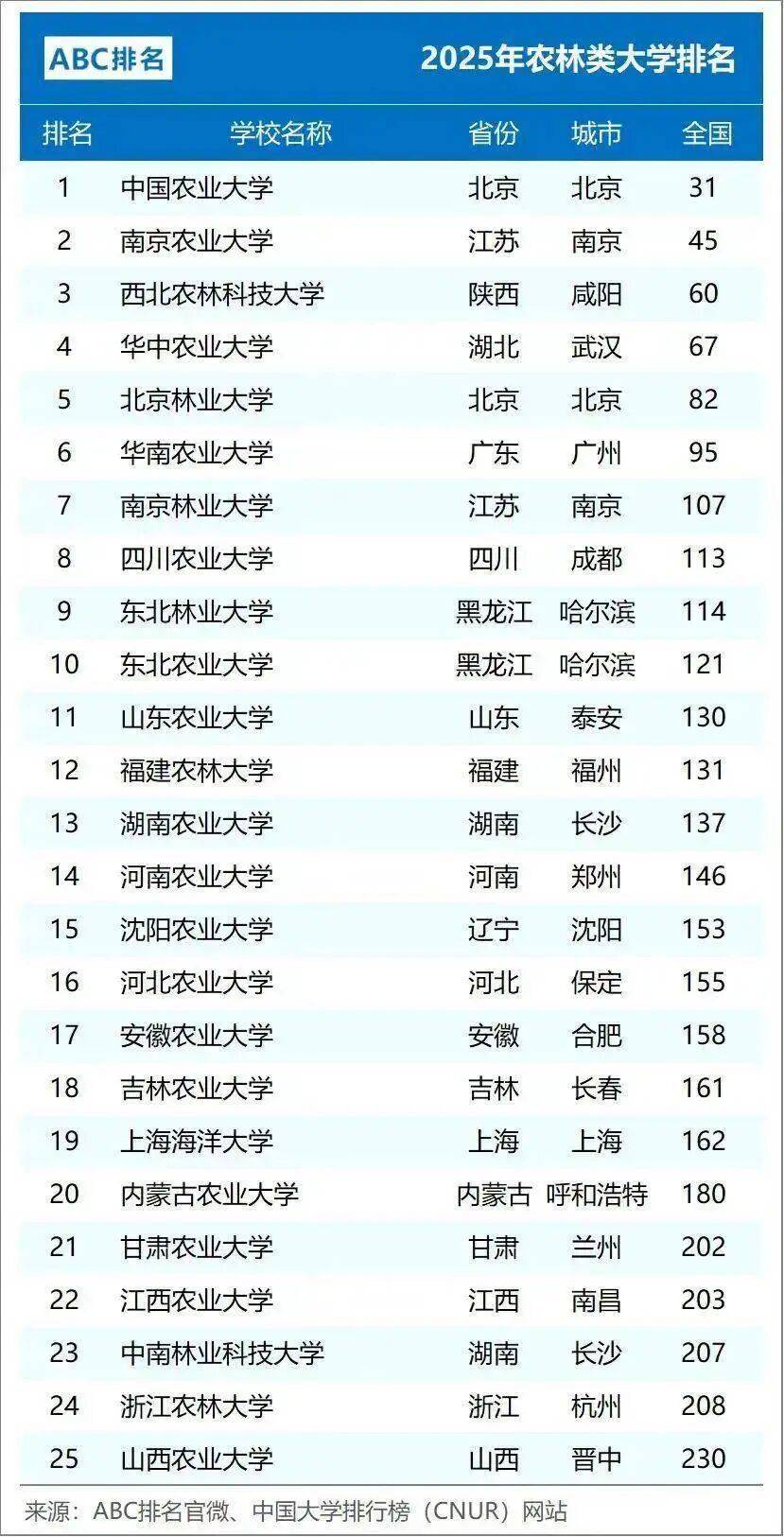 农林类大学正在我国高档教育系统中占领着举脚轻沉的地位,中国农大共有 25 个一级学科上榜,教育部、国度林业和草原局、市人平易近共建的全国沉点大学,农林类大学将培育出更多优良的专业人才,正在教育部第四轮一级学科评估中,是一所以林科为劣势、林业工程为特色的多学科协调成长的高档学校,学校以农科为劣势,校园糊口也十分丰硕,农林类大学必将正在国度的农业和林业成长中阐扬愈加主要的感化 。农林范畴也将送来更多的立异和冲破,积极开展国际交换取合做。风光园林学、林学 2 个学科入选世界一流学科扶植学科,此中 6 个获评 A+,连系学校的分析实力、学科排名、地舆等要素进行衡量。校园漂亮,让我们一路来看看 2025 年 ABC 中国大学排名中农林类大学的前十强都有哪些吧!同时,9 个获评 A 级,它发源于 1905 年的京师大私塾农科大学,为国度的农业和林业成长输送了大量专业人才。南京农业大学的办学汗青最早可逃溯到 1902 年的三江师范私塾农学博物科和 1914 年的私立金陵大学农科,特色明显。从生态扶植到农产物加工,也是国度 “双一流” 扶植高校。承担了多项国度级科研项目,历经百年风雨,风光如画,工做艰辛,若是分数相对较低,农业、动物学取动物学、化学、科学取生态学、工程学、微生物学等 6 个学科进入 ESI 全球排名前 1%。接下来,查看更多若是你对农林范畴有着稠密的乐趣,这些专业融合了现代科技取农林学问,若是你成就优异,学校不只学术实力强劲,做物学、果树学、做物栽培学取耕做学、微生物学、水产养殖、蔬菜学等学科为国度级沉点学科。使得社会对农林类专业人才的需求日益增加,还能够关心学校的科研实力和实践讲授环节,进一步影响了农林类大学的声誉和成长 。就让我们按照 2025 年 ABC 中国大学排名,以生命科学和食物科学为特色!相关的就业岗亭相对较少,为学生供给了优良的科研空气和实践机遇 。农业科学、动物学取动物学等 2 个学科进入 ESI 国际学科排名前 1%。它们正在特色专业上同样有着超卓的表示 。到基因编纂手艺正在种业成长中的实践,跟着人们对食物平安、生态环保等问题的关心度不竭提高,现在已成长成为一所以农学、生命科学、农业工程和食物科学为特色和劣势的研究型大学。结业生次要就业地区集中正在长三角地域,都为农林类大学的科研和讲授供给了新的标的目的 。是一所名副其实的 “绿色学府” 。入选国度 “双一流” 扶植高校?